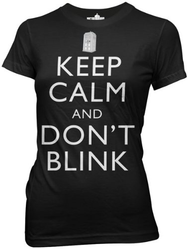Doctor Who Keep, This womens juniors Doctor Who Keep Calm and Don't Blink Tee--inspired by the Doctor Who episode, Blink, and the British WWII era "Keep Calm and Carry On" posters. This t-shirt is a unique twist on two British classics.